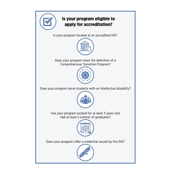 Review the following questions to determine if your program meets the criteria to apply for accreditation. The IHEAC accredits programs at accredited institutions of higher education (IHE) that serve students with intellectual disability (ID) as defined in the Higher Education Opportunity Act of 2008 (as amended, HEA).&#x20;